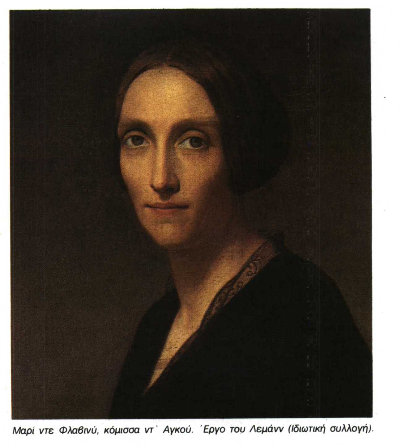 Αγκού (Agou.lt), Μαρί ντε Φλαβινύ (de Flavigny) κόμισσα ντ (1805 - 1876). Γαλλίδα διανοούμενη, περισσότερο γνωστή για την καλλονή της καθώς και για την αντισυμβατική ζωή της. Στο σαλόνι της σύχναζαν σημαντικοί άνθρωποι των γραμμάτων (Αλφρέντ ντε Βινύ*, Χάινριχ Χάινε*, Γεωργία Σάνδη*, Σαρλ Ωγκυστέν Σαιντ ...