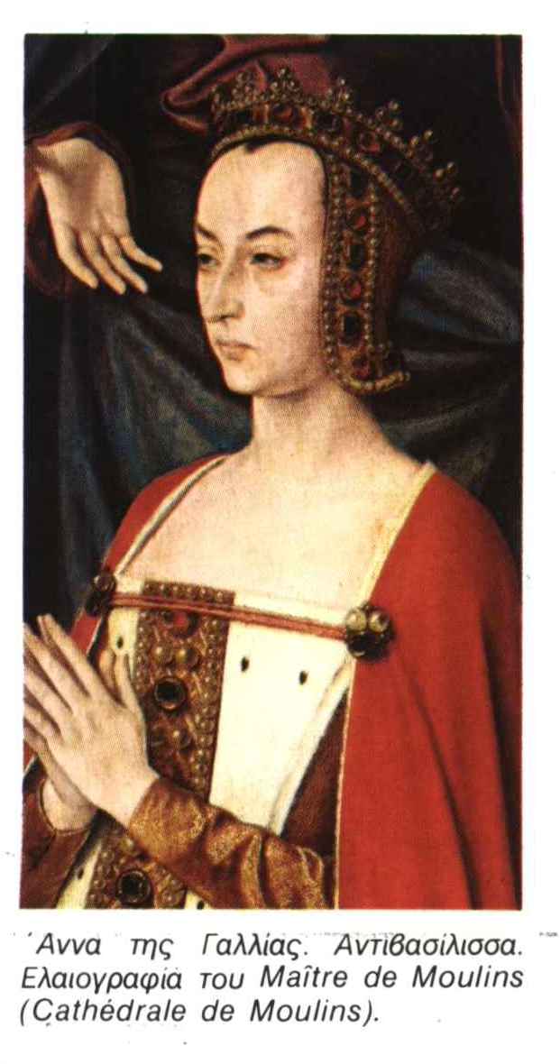 ?ννα της Γαλλίας (1460 - 1522). Αντιβασίλισσα της Γαλλίας (1483 - 1491). Πρωτότοκη κόρη του Λουδοβίκου ΙΑ'* παντρεύτηκε (1472) σε ηλικία 12 χρονών τον Πέτρο Β' των Βουρβώνων*, δούκα του Μπω- ζαί. Διατέλεσε αντιβασίλισσα κατά την ανηλικότητα του αδερφού της Καρόλου Η'*, και κυβέρνησε τη Γαλλία με τρόπο ...