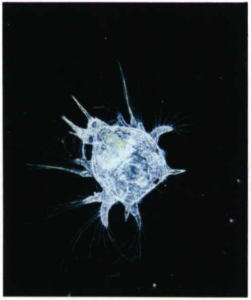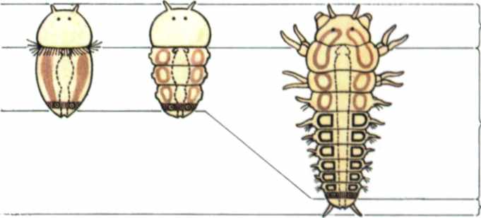 Ναυπλιος. η γνωστή προνύμφη των καρκινοειδών. Στο στάδιο της προ- νύμφης των Αρθροπόδων διακρίνεται το πρόσθιο «άκρον», το «τέλσον» και μικρός μόνο αριθμός μεταμερών.