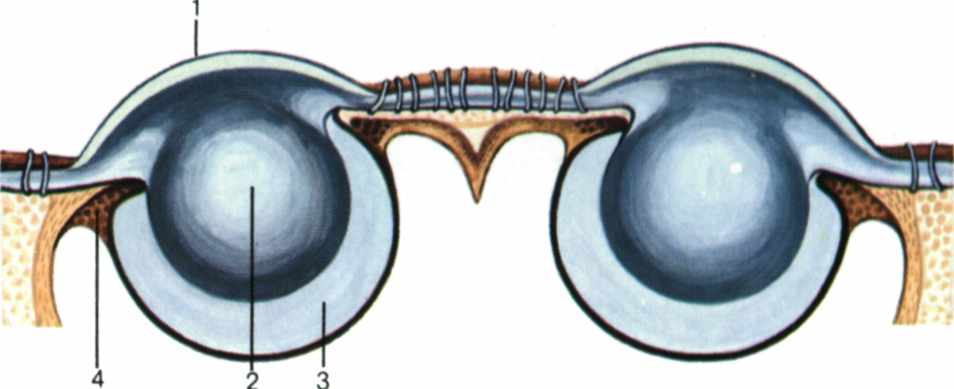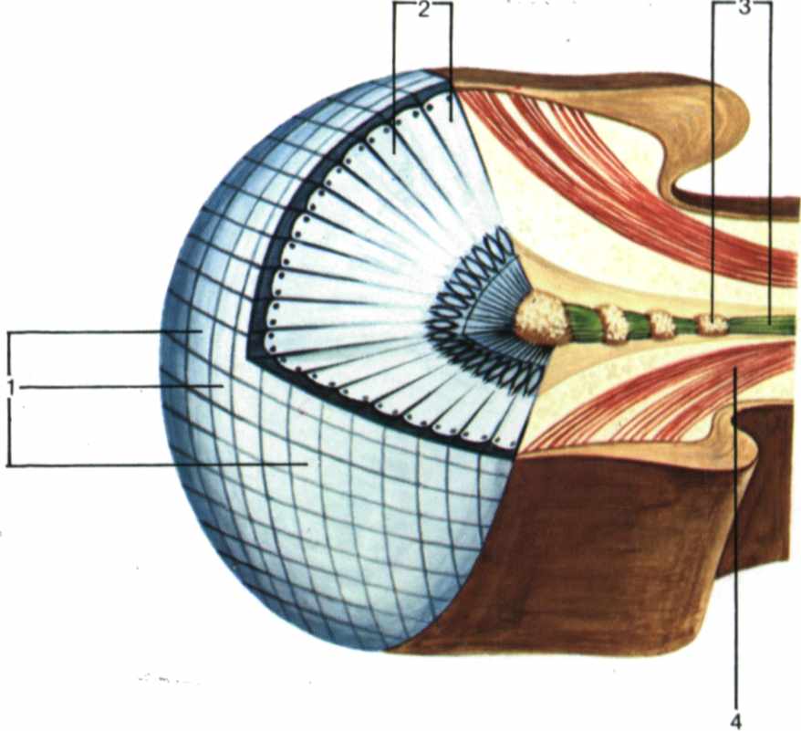 Σχηματική παράσταση σύνθετου οφθαλμού Αρθροπόδου (Καρκινοειδές) 1. φακοί 2. ομματίδια 3. οπτικό νεύρο-γάγγλια 4. μυς του οφθαλμού