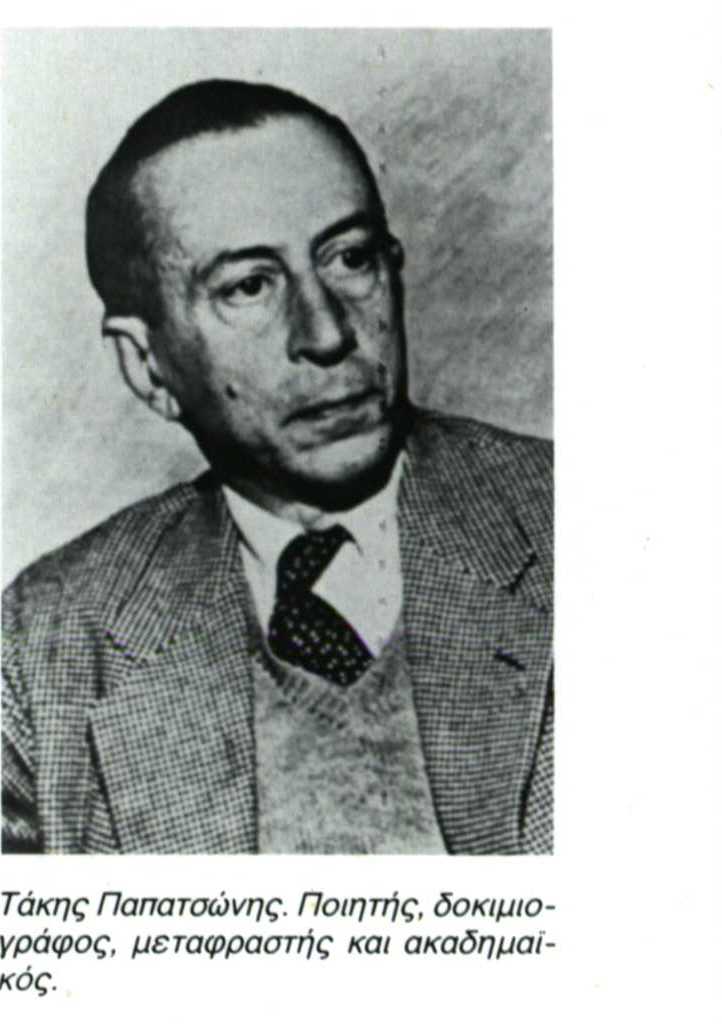 Παπατσώνης, Τάκης (Αθήνα, 1895 - 1976). Ποιητής, εισηγητής του ελεύθερου στίχου στη νεωτερική ποίηση, δοκιμιογράφος και μεταφραστής· ακαδημαϊκός. Απόγονος της οικογένειας των Παπατζώνηδων από το Ναζήρι της Μεσσηνίας, αγωνιστών του 1821, βυζαντινής απώτερης καταγωγής, που έφεραν και τον παλατιανό τίτλο ...