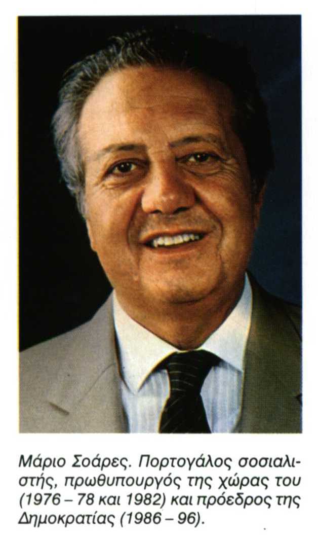 Σοάρες (Soares), Μάριο (1924). Πορτογάλος σοσιαλιστής πολιτικός, που διαδραμάτισε σημαντικό ρόλο στους πολύχρονους αγώνες για την αποκατάσταση της δημοκρατίας στην Πορτογαλία. Διατέλεσε δύο φορές πρωθυπουργός της χώρας του (1976 - 78 και 1982) και από το 1986 ως το 1996 πρόεδρος της Πορτογαλικής Δημοκρατίας. ...