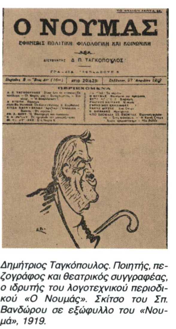 Ταγκόπουλος, Δημήτριος (Ύδρα, 1867 - Αθήνα, 1926). Ποιητής, πεζογράφος και θεατρικός συγγραφέας, ο ιδρυτής του πρωτοποριακού λογοτεχνικού περιοδικού Ο Νουμάς. Σπούδασε ιατρική στο Πανεπιστήμιο Αθηνών, ανακηρύχτηκε διδάκτοράς του το 1890 και άσκησε για ένα διάστημα το ιατρικό επάγγελμα στη Θεσσαλία. ...